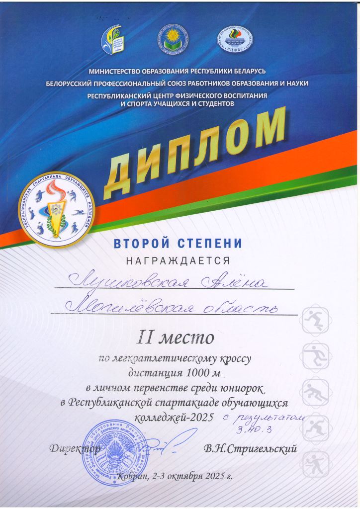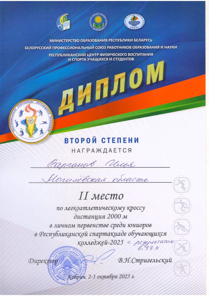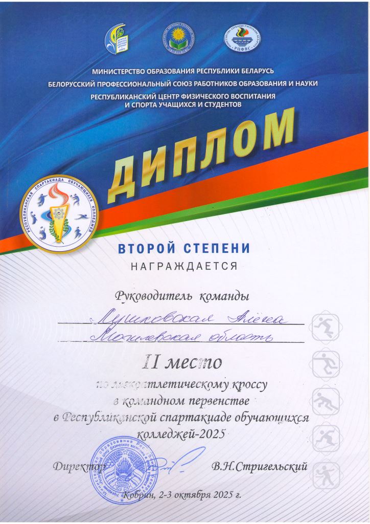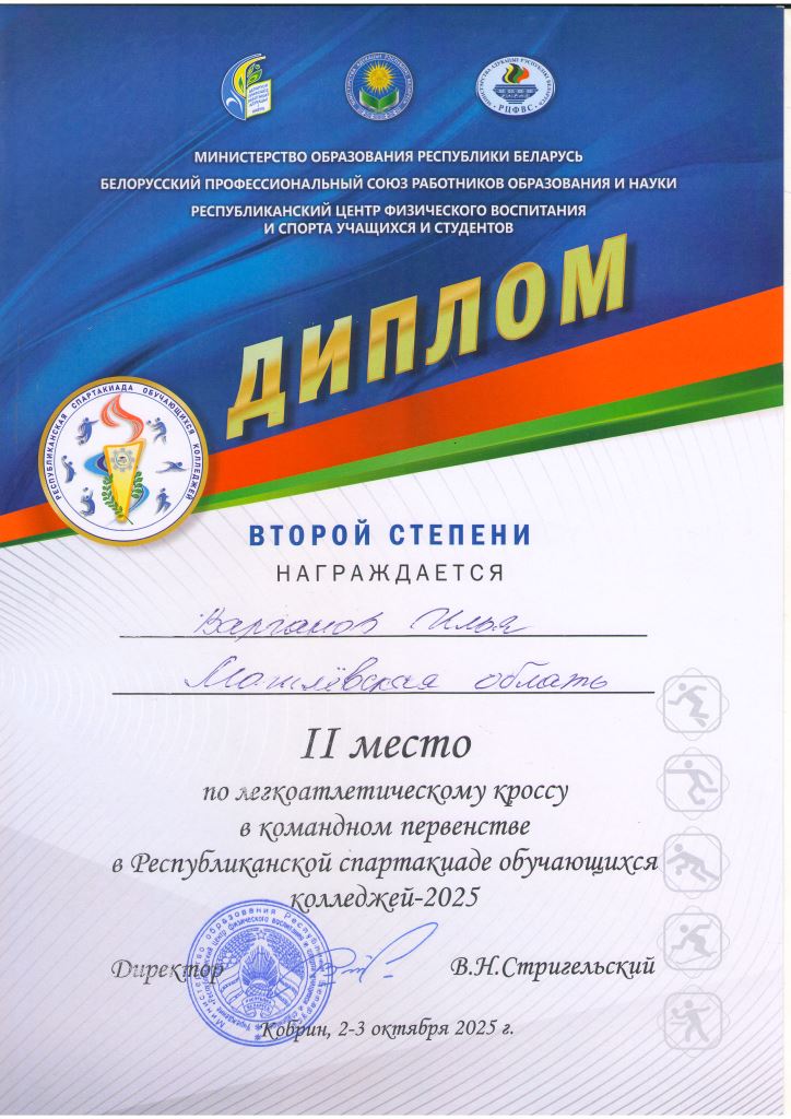 В городе Кобрине 2-3 октября 2025 года прошли республиканские соревнования по легкоатлетическому кроссу в рамках республиканской Спартакиады обучающихся колледжей – 2025. Поздравляем Лушковскую Алёну, учащуюся учебной группы № 424, занявшую 2 место в личном первенстве на дистанции 1000м. и Варганова Илью, учащегося учебной группы № 523, занявшего 2 место в личном первенстве на дистанции 2000м. Общими усилиями сборная команда Могилёвской области заняла почётное 2 место в данных соревнованиях.