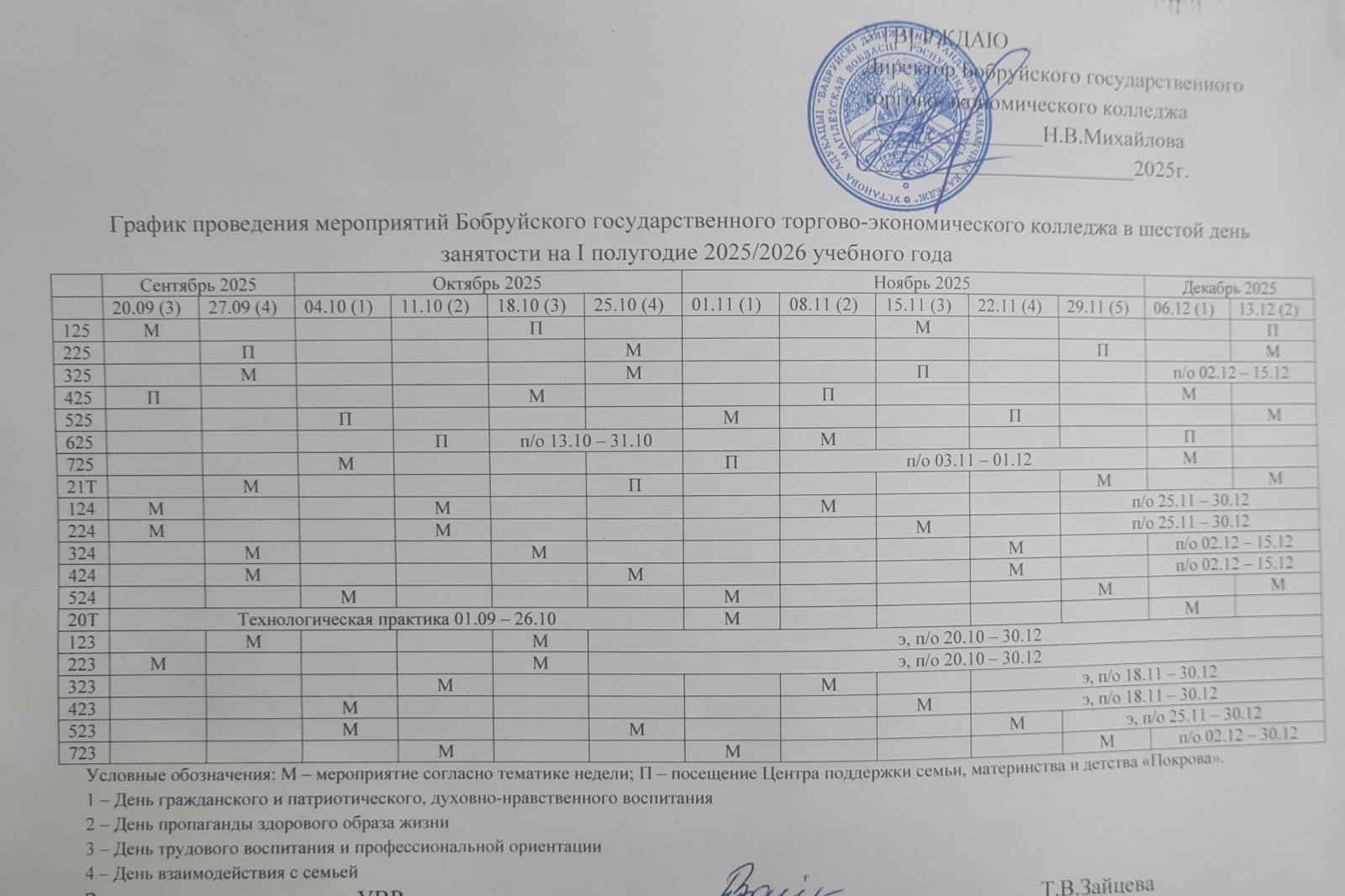График проведения мероприятий в 6-й день занятости на I полугодие 2025 – 2026 учебного года