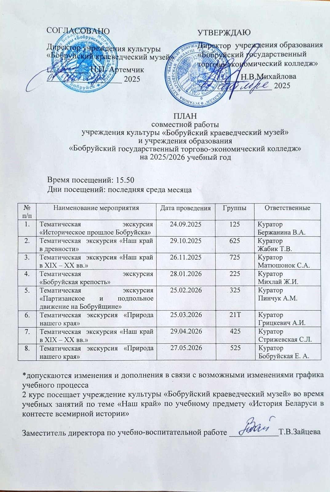 План совместной работы УК “Бобруйский краеведческий музей” и УО “Бобруйский государственный торгово-экономический колледж” на 2025/2026 учебный год