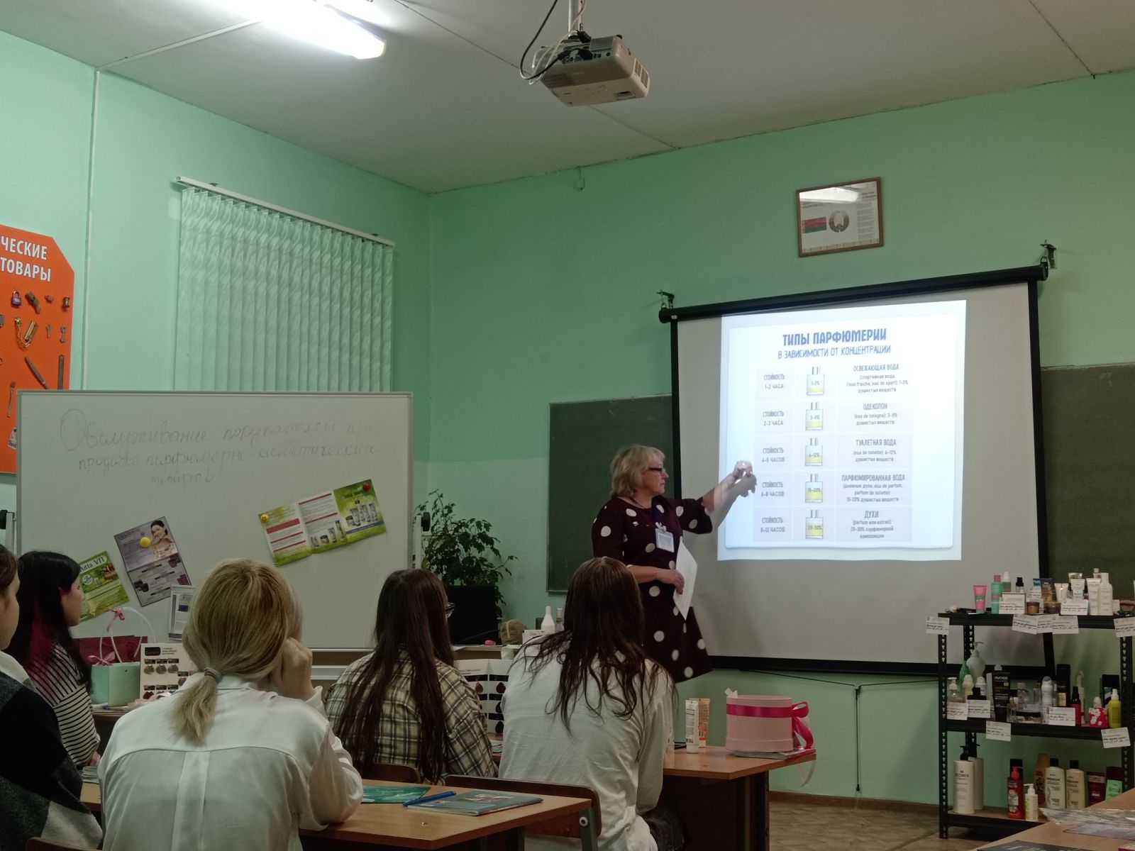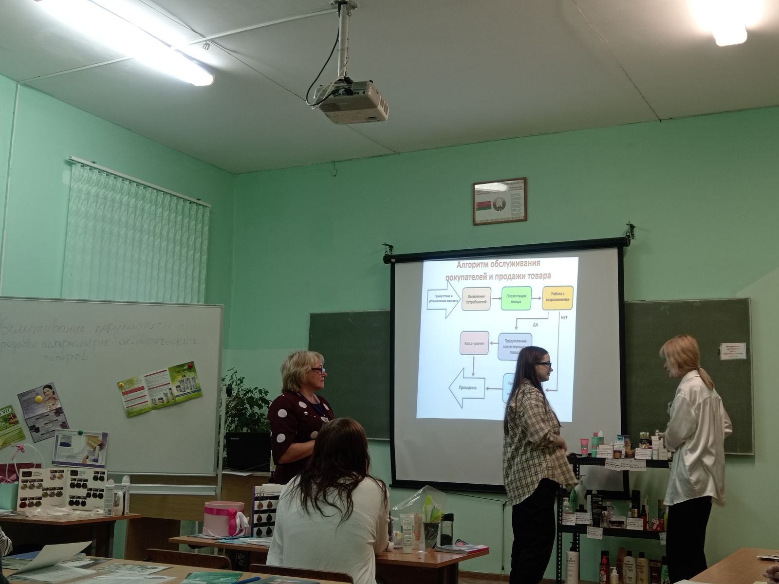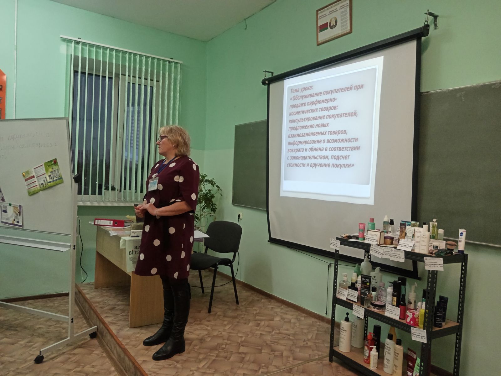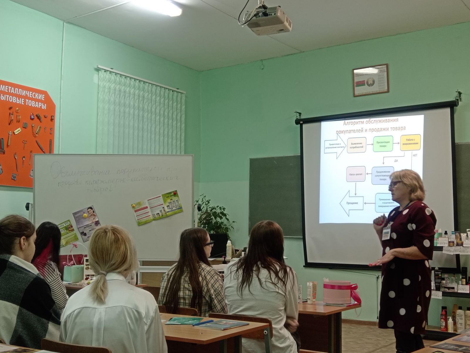 12.11.2025 мастер производственного обучения учреждения образования Рекиш Жанна Иосифовна провела открытое учебное занятие по теме: «Обслуживание покупателей при продаже парфюмерно-косметических товаров: консультирование покупателей, предложение новых взаимозаменяемых товаров, информирование о возможности возврата и обмена в соответствии с законодательством, подсчет стоимости и вручение покупки» в учебной группе № 123