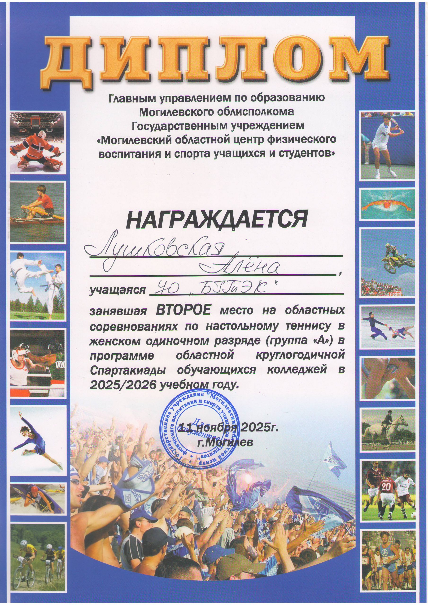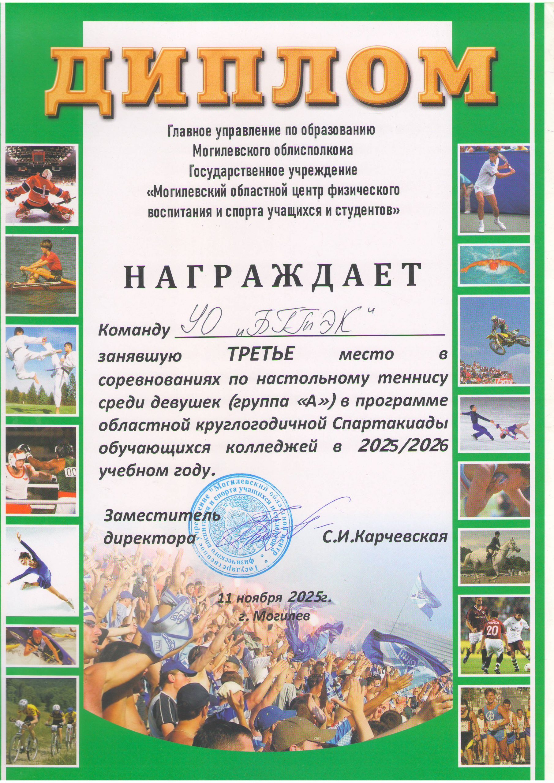 11 ноября 2025 года на спортивной базе учреждения образования «Могилёвский государственный колледж строительства имени А.П.Старовойтова» прошли областные соревнования по настольному теннису среди девушек в рамках областной Спартакиады среди обучающихся колледжей 2025/2026 учебного года (группа «А»)