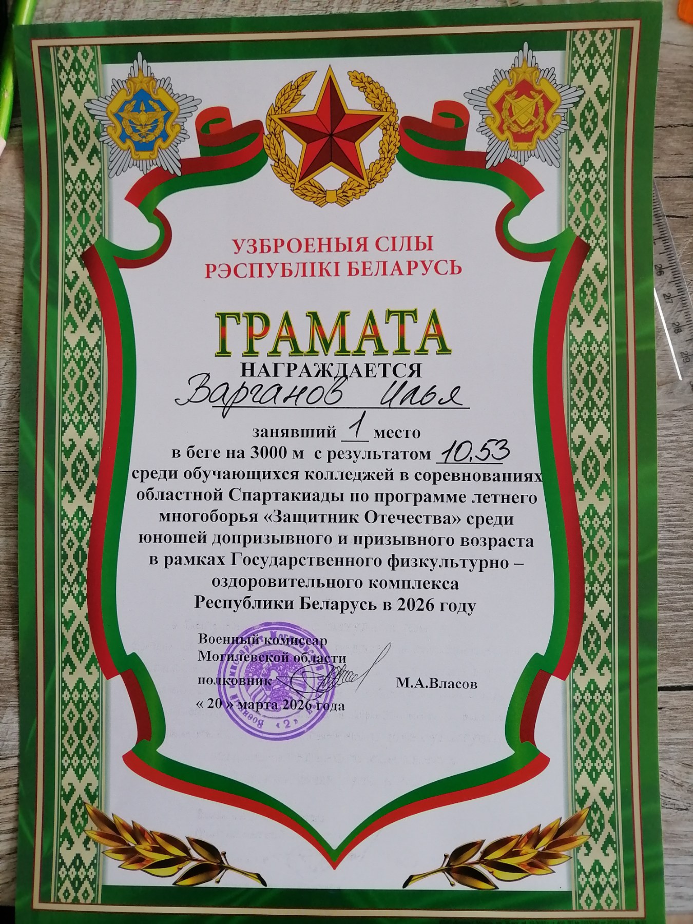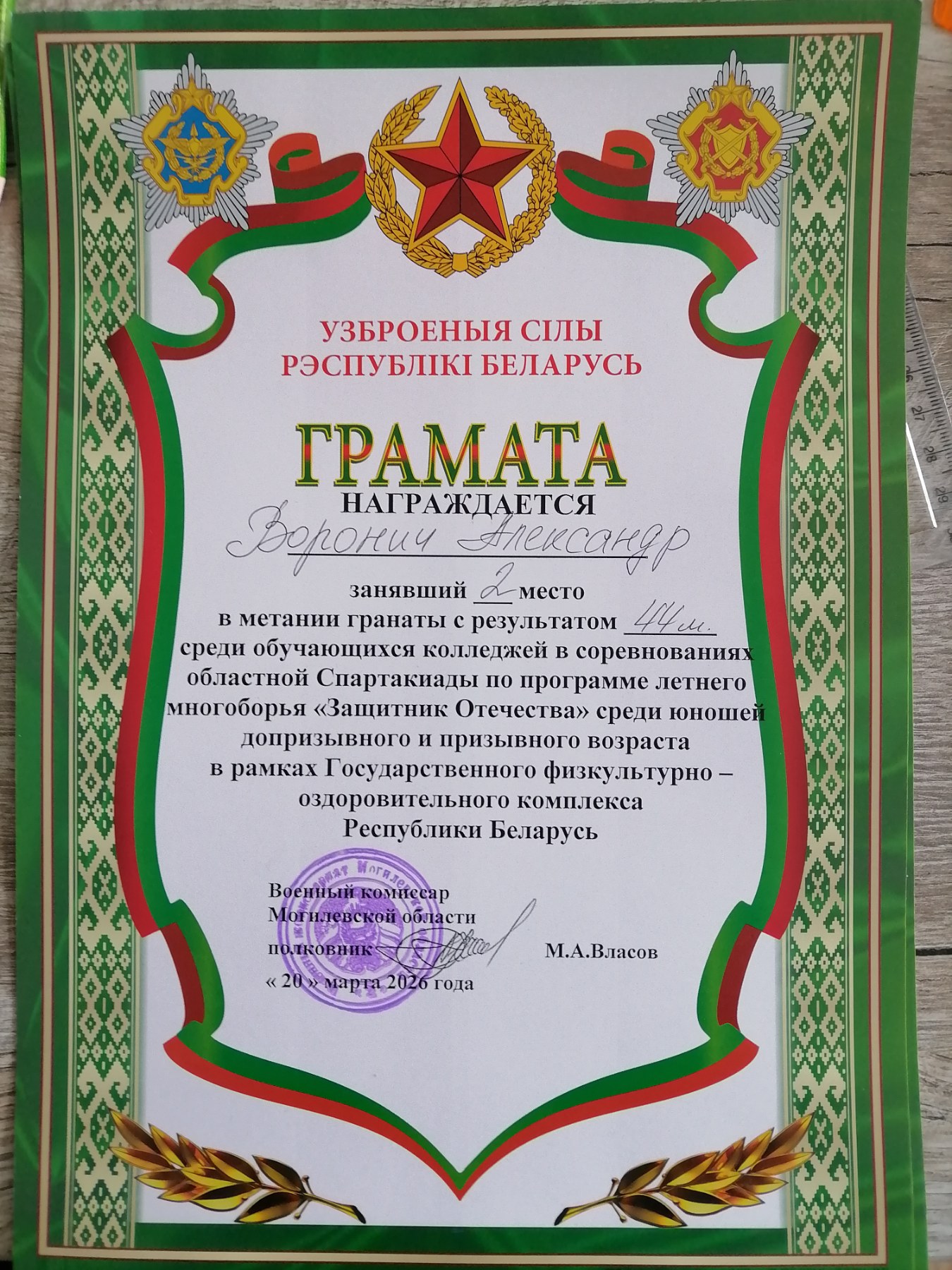 18-20 марта в городе Могилёве прошли областные соревнования по летнему многоборью «Защитник Отечества» среди юношей допризывного и призывного возраста ГФОК РБ «Готов к труду и обороне» среди учащихся колледжей группа «А», в данный вид многоборья входят такие виды как: пулевая стрельба, подтягивания, метание гранаты, бег 100м и 3000м, плавание 50м.