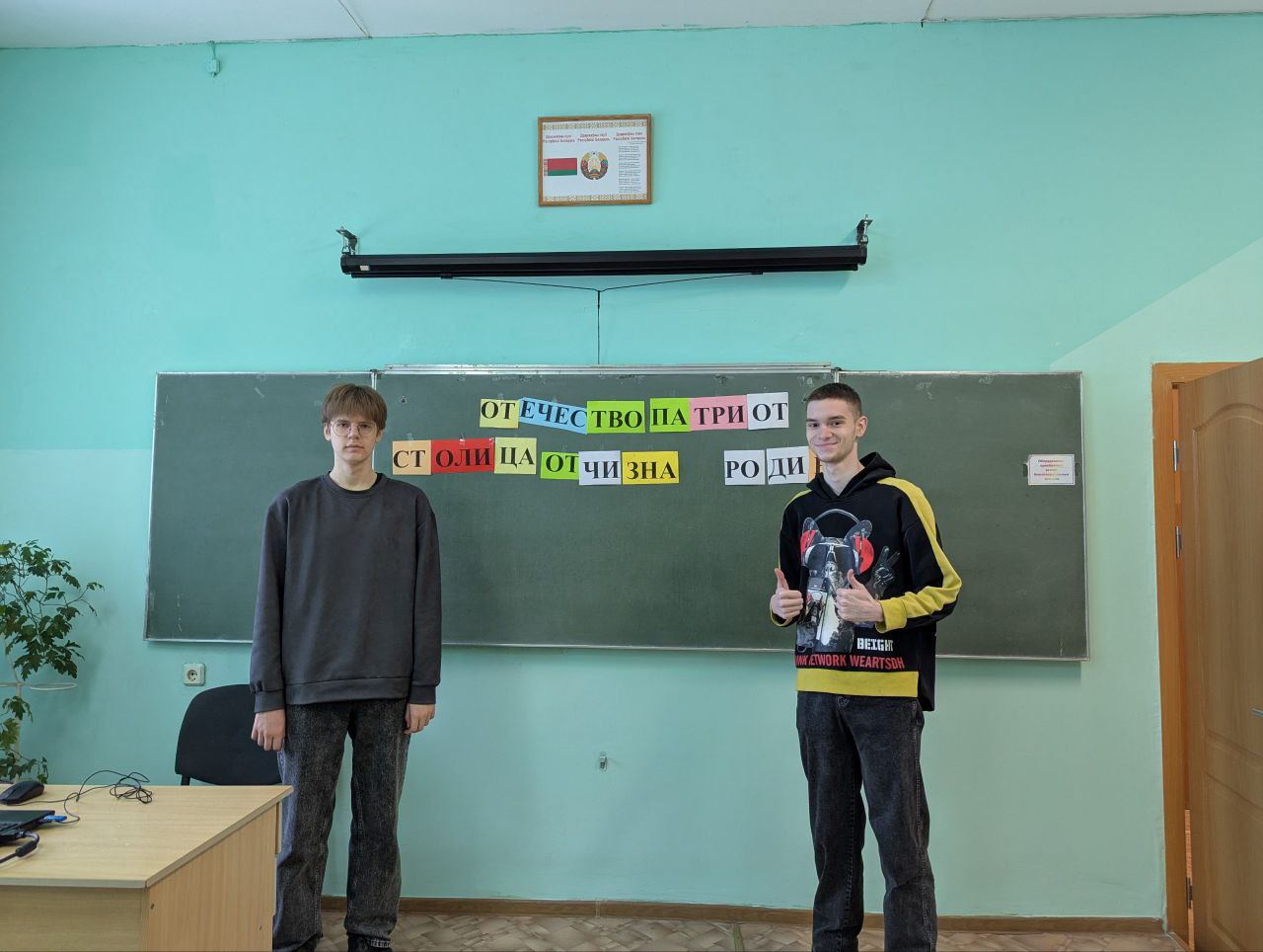 6 января 2026 года с учащимися 1 и 2 курсов преподавателем Ильинич И.Г. была проведена интеллектуальная игра «Я – патриот своей страны», цель которой – формирование активной гражданской позиции подрастающего поколения. Игра состояла из двенадцати туров: «Кто быстрее?», «Перевод», «Национальные обряды и праздники», «Синонимы», «Ребусы», «Загадки», «Аббревиатура», «Собери пазл Беларуси», «Патриотические кирпичи», «Анограмма», «Черты беларуса», «Черный ящик». В игре приняли участие учебные группы № 125, 325, 425, 525, 625, 21Т. После каждого тура игру покидал один из участников. По результатам последнего тура определился победитель, им стал учащийся учебной группы №625 Сугако Даниил.