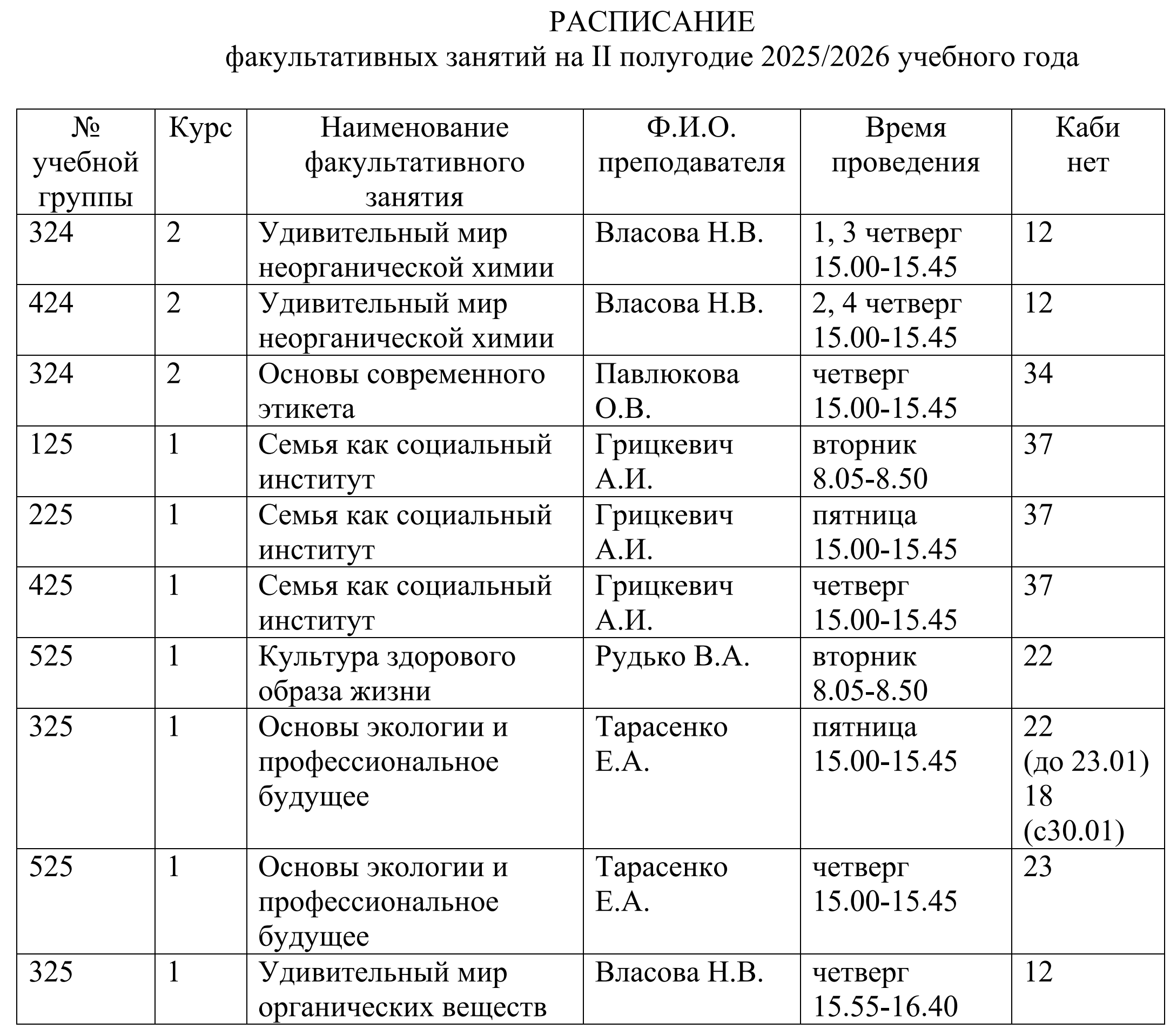 Расписание факультативных занятий на II полугодие 2025/2026 учебного года